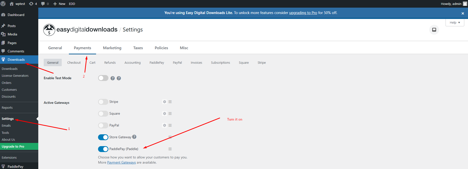 2. Under the General tab, check the box for Paddle to enable it as a gateway.