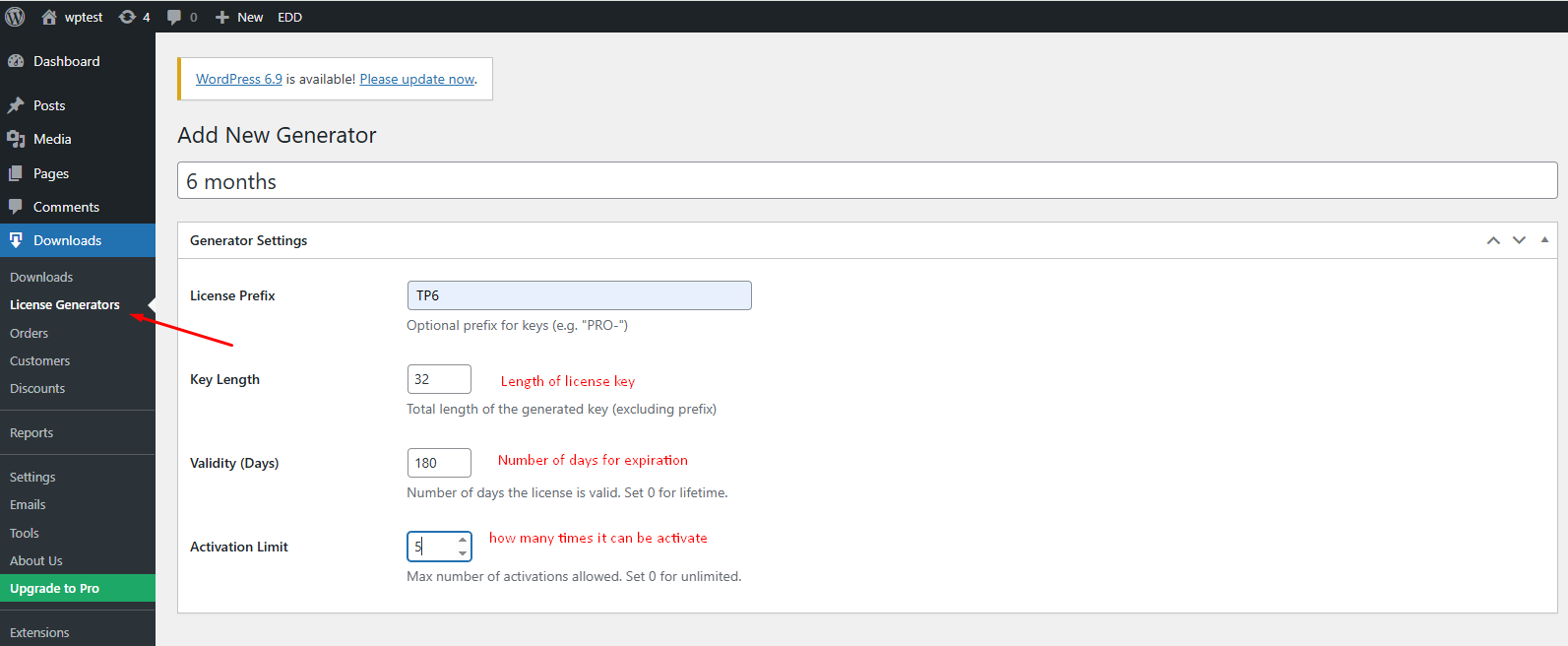 - Validity: How long (in days) the license is valid (leave 0 for lifetime).