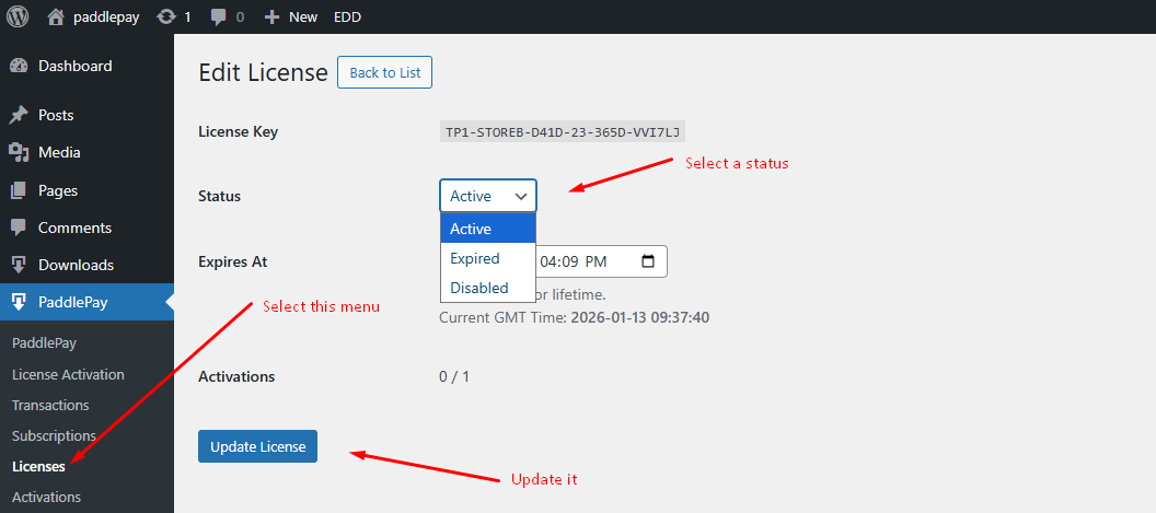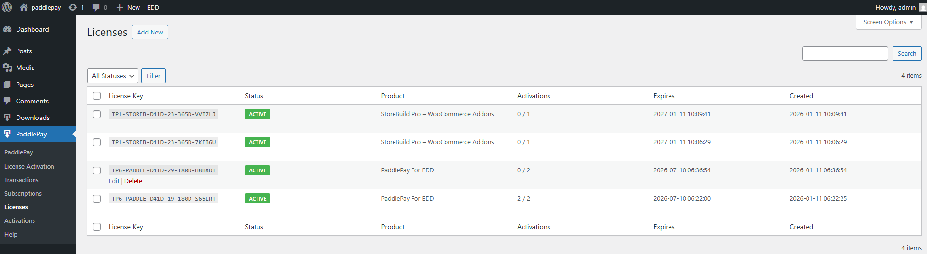 How to Manage Customer Licenses? Navigate to PaddlePay > Licenses.Here you can see all issued license keys.Actions:Delete: Revoke a license key.Edit: Modify expiration dates or activation limits manually.To see where licenses are being used, go to PaddlePay > Activations. This logs every domain where a key is active. Manage a license manually
